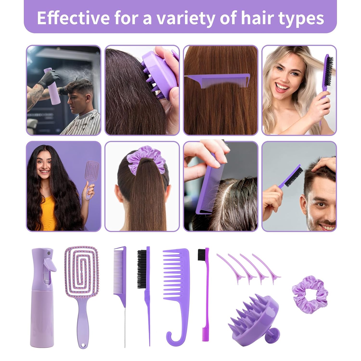 12 pcs Hair Brush Set,Detangler Brush with Hair Spray Bottle Scalp massager for Wet Dry Curly Hair, Bristle Hair Brush Hair Comb for Women Girl,Hair Styling Tools (Purple)