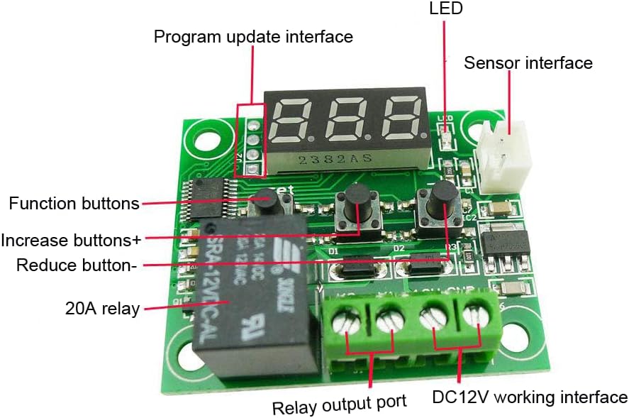 【Function】The W1209 thermostat module controller has a sensor input, keys, LED display, and a relay. It can be reprogrammed for control, timing, or counting.