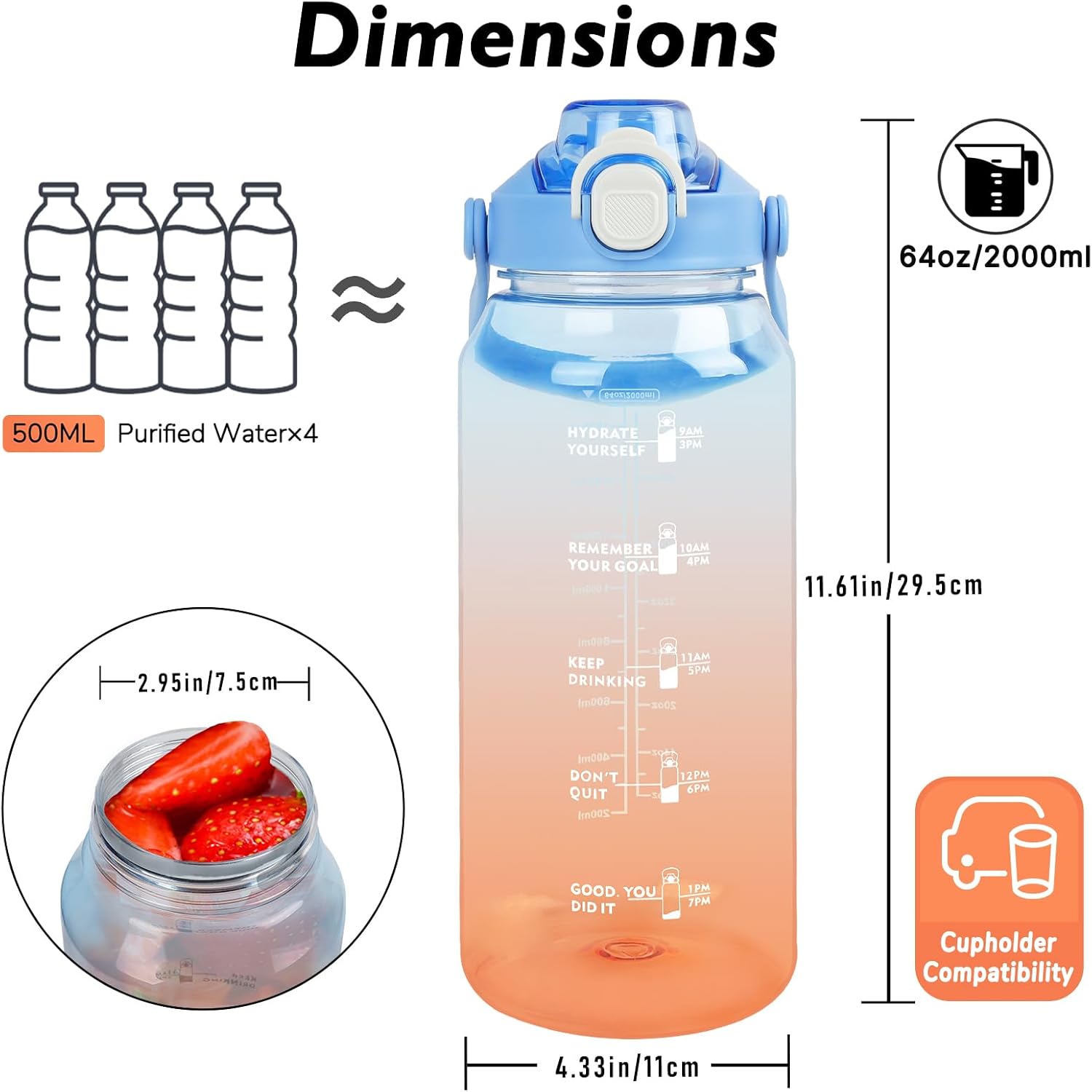 64oz Sports Water Bottle with Fruit Infuser, 2 in 1 Straw and Chug Motivational Water Bottle with Time Marker, Half Gallon Large Water Jug with Handle for Travel Fitness Gym Outdoor (Blue)