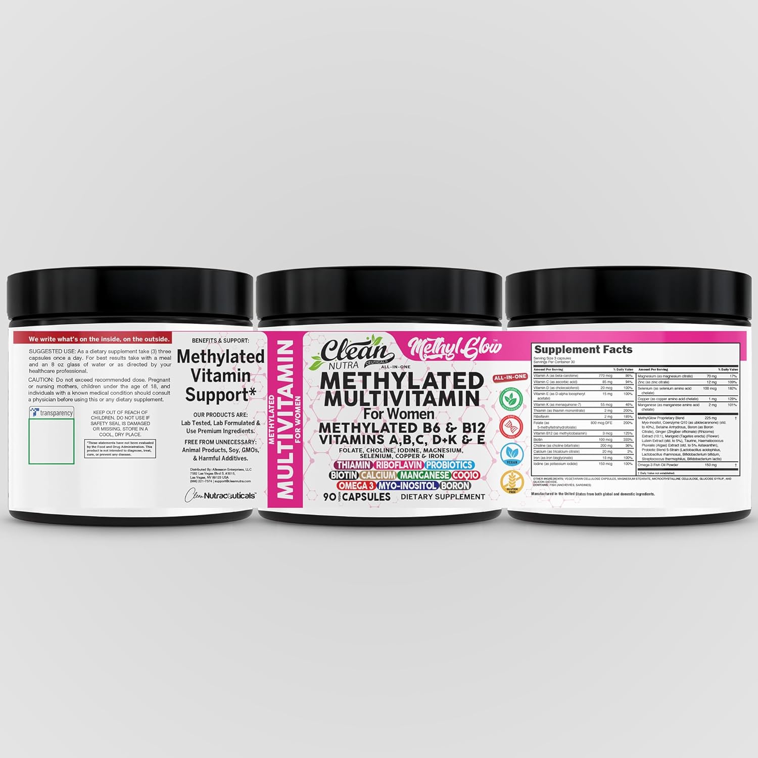 Clean Nutra Methylated Multivitamin for Women with Vitamins B6 B12 A B C D K and E, Folate, Choline, and Omega 3 | Premium Vitamin Supplement with Essential Nutrients | 90 Capsules
