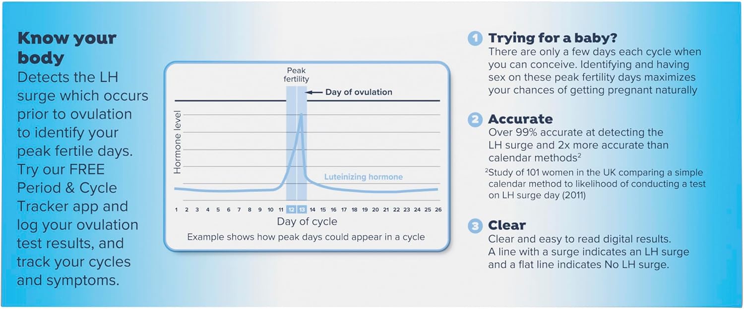 If you’re trying to pinpoint your most fertile days, this digital ovulation test is a strong choice. The technology detects the luteinizing hormone (LH) surge, which typically occurs 24–36 hours before ovulation. In lab testing, it’s shown over 99% accuracy at identifying an LH surge.What really stands out is the digital display you don’t have to interpret faint lines. The simple “smiley face = peak fertility” format makes it clear and user-friendly. This ease of reading can reduce user error, which studies show is a real issue with older line tests.Here are some key highlights from my experience:Pros:• Clear, easy-to-read digital results (no guessing at lines)• Strong accuracy for detecting LH surge reliable for timing intercourse or IUI• The kit gives plenty of test sticks so you can test daily without feeling like you’re wasting tests• Trusted brand with good user feedbackConsiderations:• Like all ovulation kits, it detects hormonal surges, not guaranteed ovulation some women still may not ovulate or may have lower LH surges that escape detection.• It’s slightly more expensive than basic stick tests, because you’re paying for the digital holder and clearer display• It still requires regular daily testing during the correct window missing days or testing too early can affect resultsUsage tip: Start testing based on your shortest cycle length, use first-urine or minimal fluid intake before testing, and continue until you see the “peak fertility” symbol, which means the ideal window for conception is now (and the next ~24–48 hours).