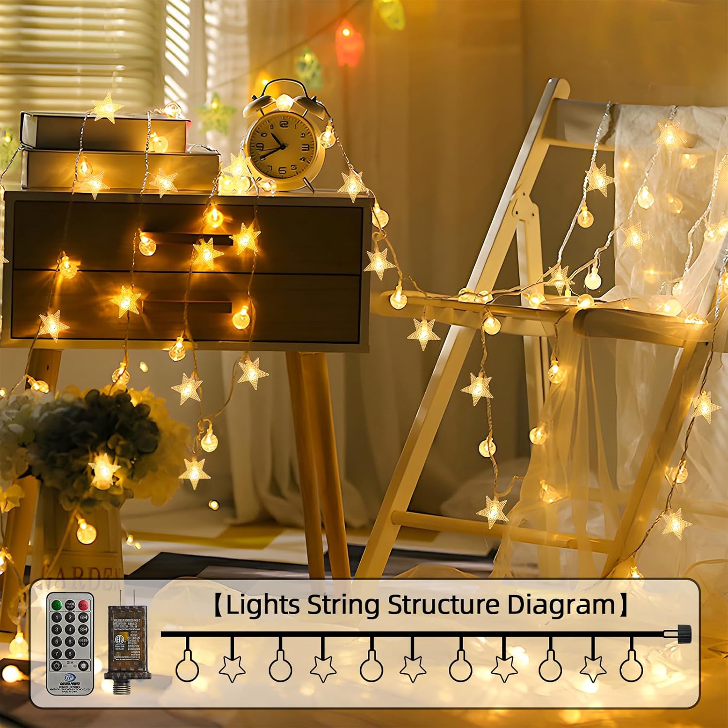 I absolutely love these!! The mix of globes and stars is everything!! they say they are “fairy” lights, but are much more substantial that traditional fairy lights. This strand is generous in length and feels sturdy. I was going to use them for Christmas, but I think I may use them year-round on my screened in patio instead. The light is nice and warm, which I prefer over the stark blue white LED’s. These are so much fun!
