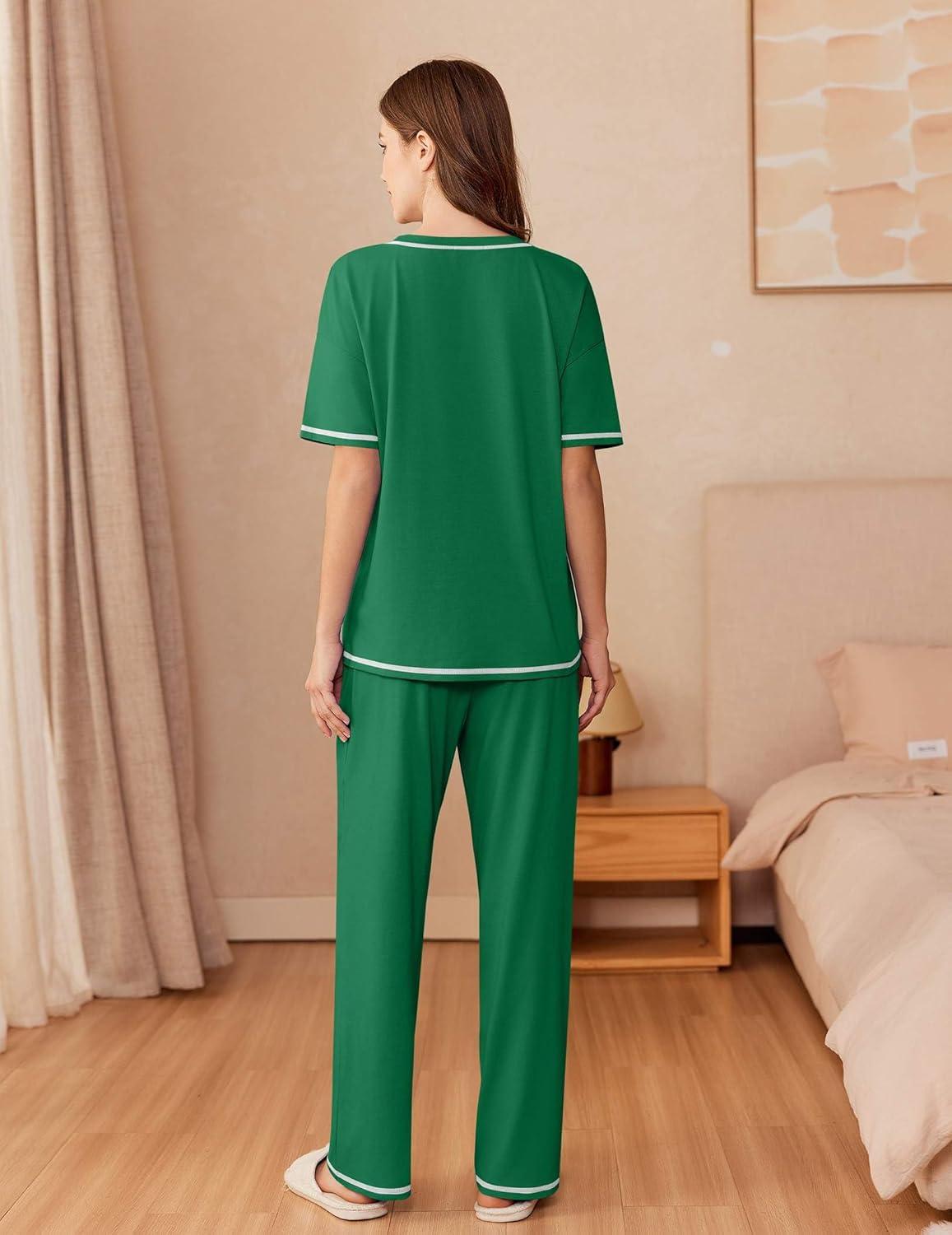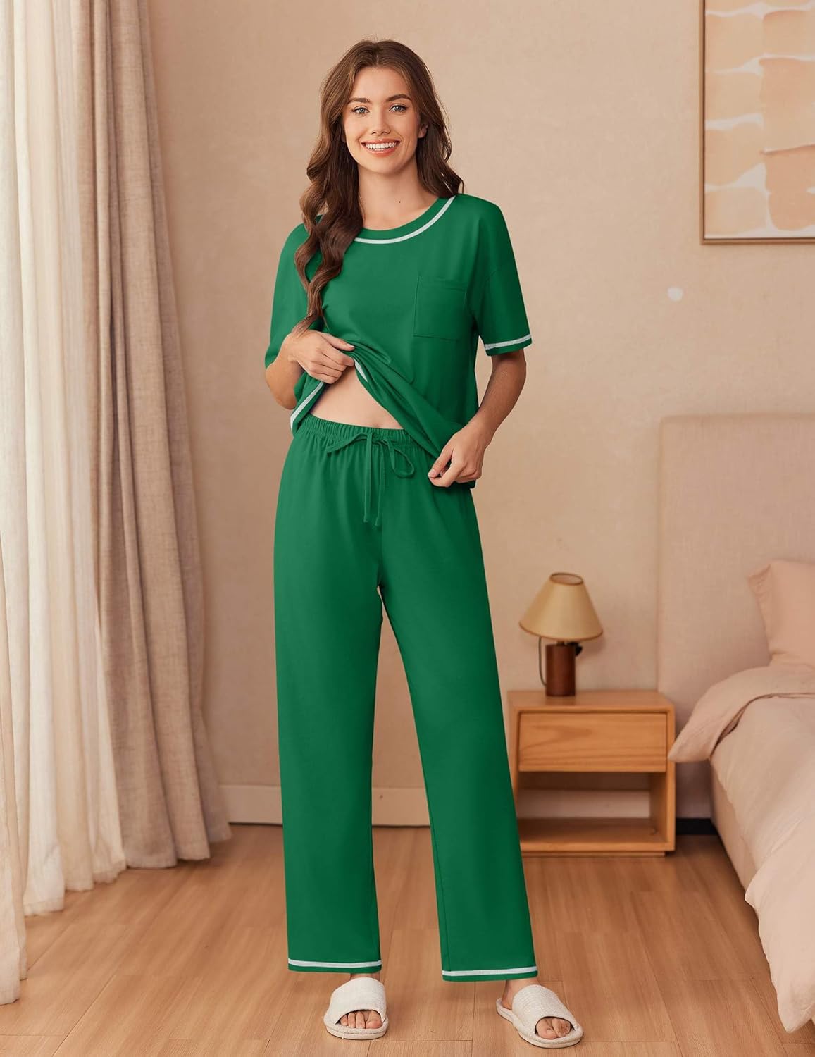 Ekouaer Cotton Pajamas Sets for Women Soft Contrast Piping Lounge Set 2 Piece Short Sleeve Pj Set with Pockets