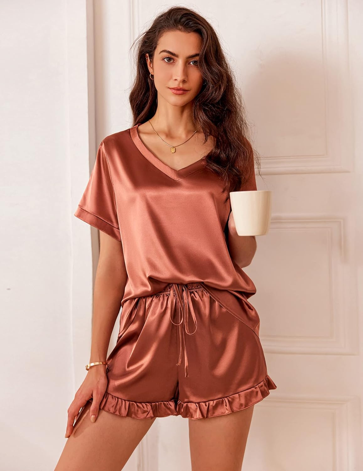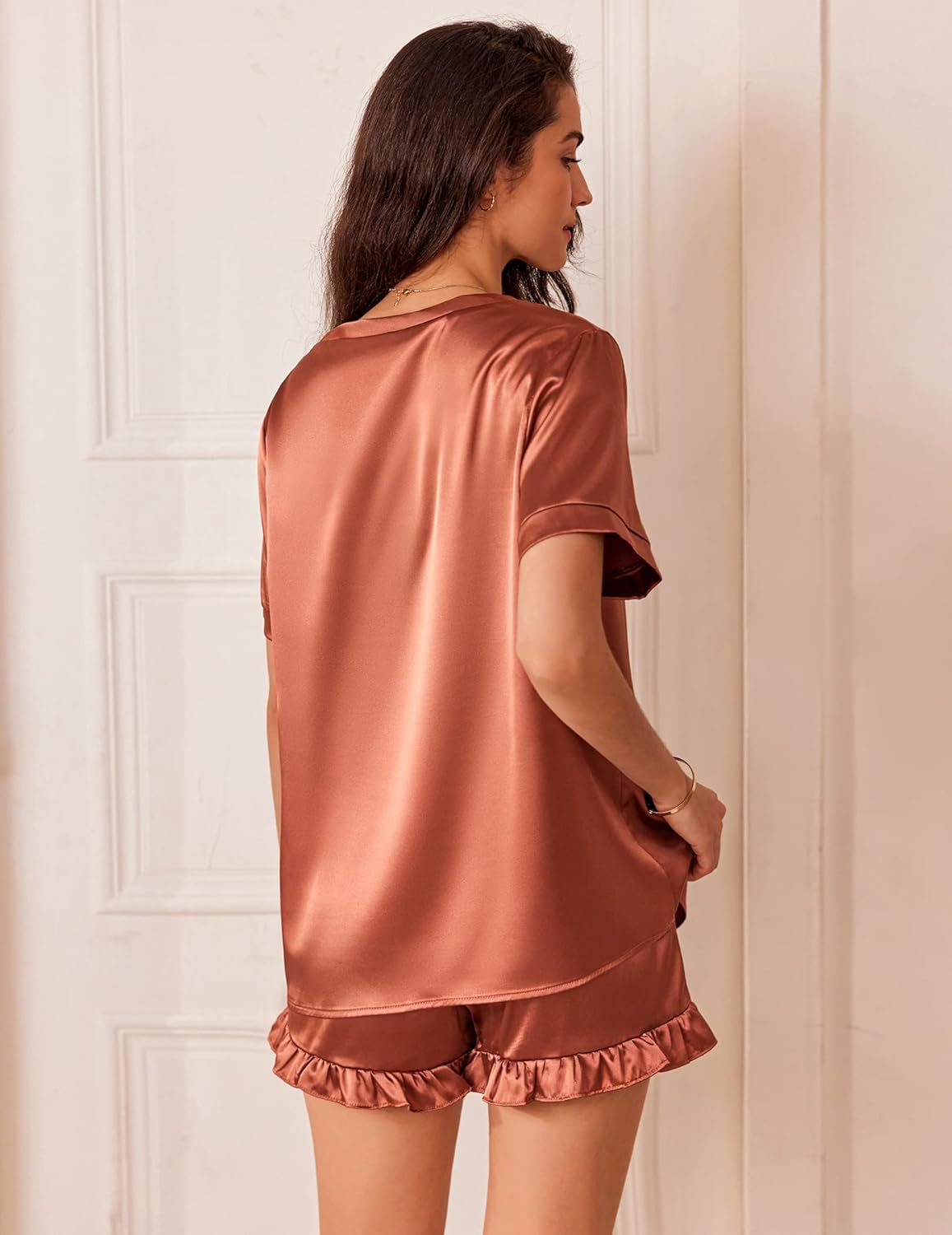 Ekouaer Satin Pajamas for Women Short Sleeve Silk Sleepwear 2 Piece Pjs Set with Ruffled Shorts Casual Loungewear