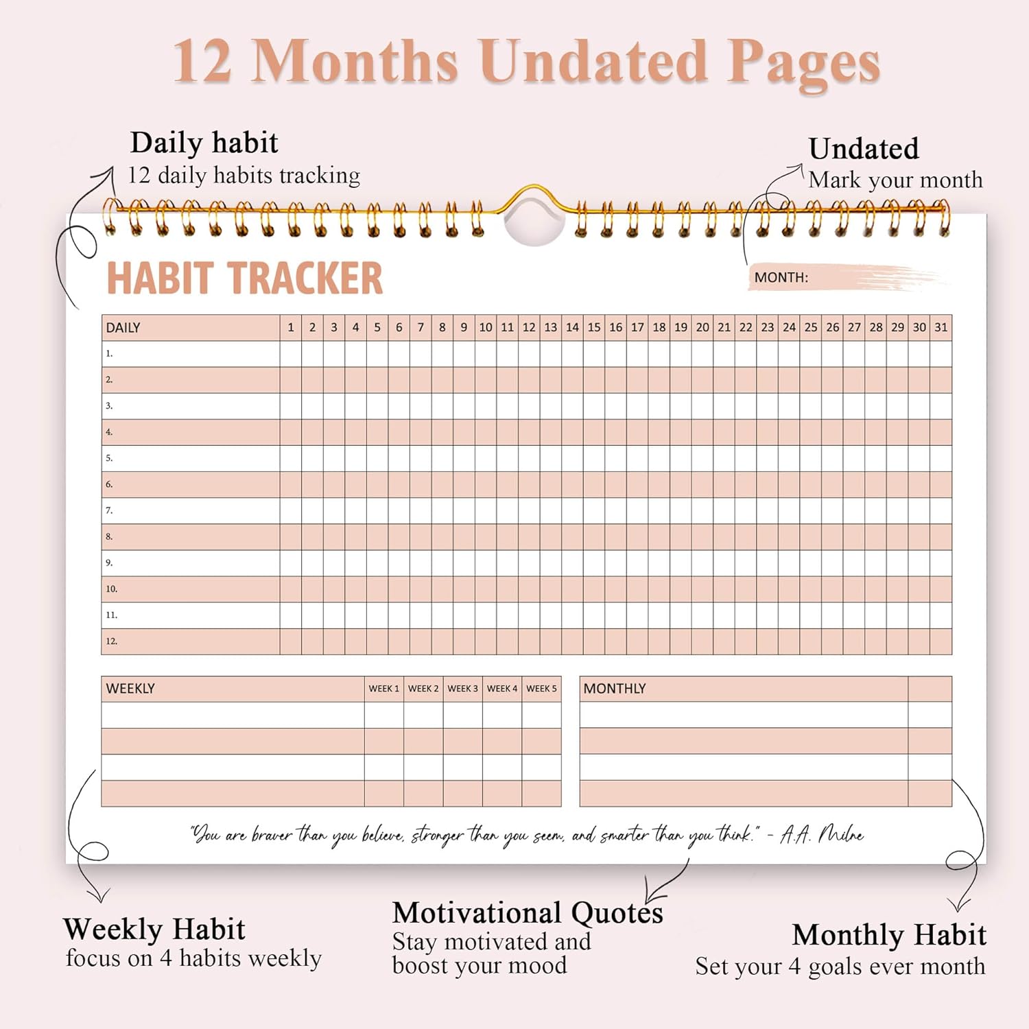 Habit Tracker Calendar, Daily Weekly Goal and Habit Tracker Journal, 12 Months Undated Habits Tracker Planner with Spiral Binding, Boost Productivity Tool and Workout Calendar, 11.7″x8.5″