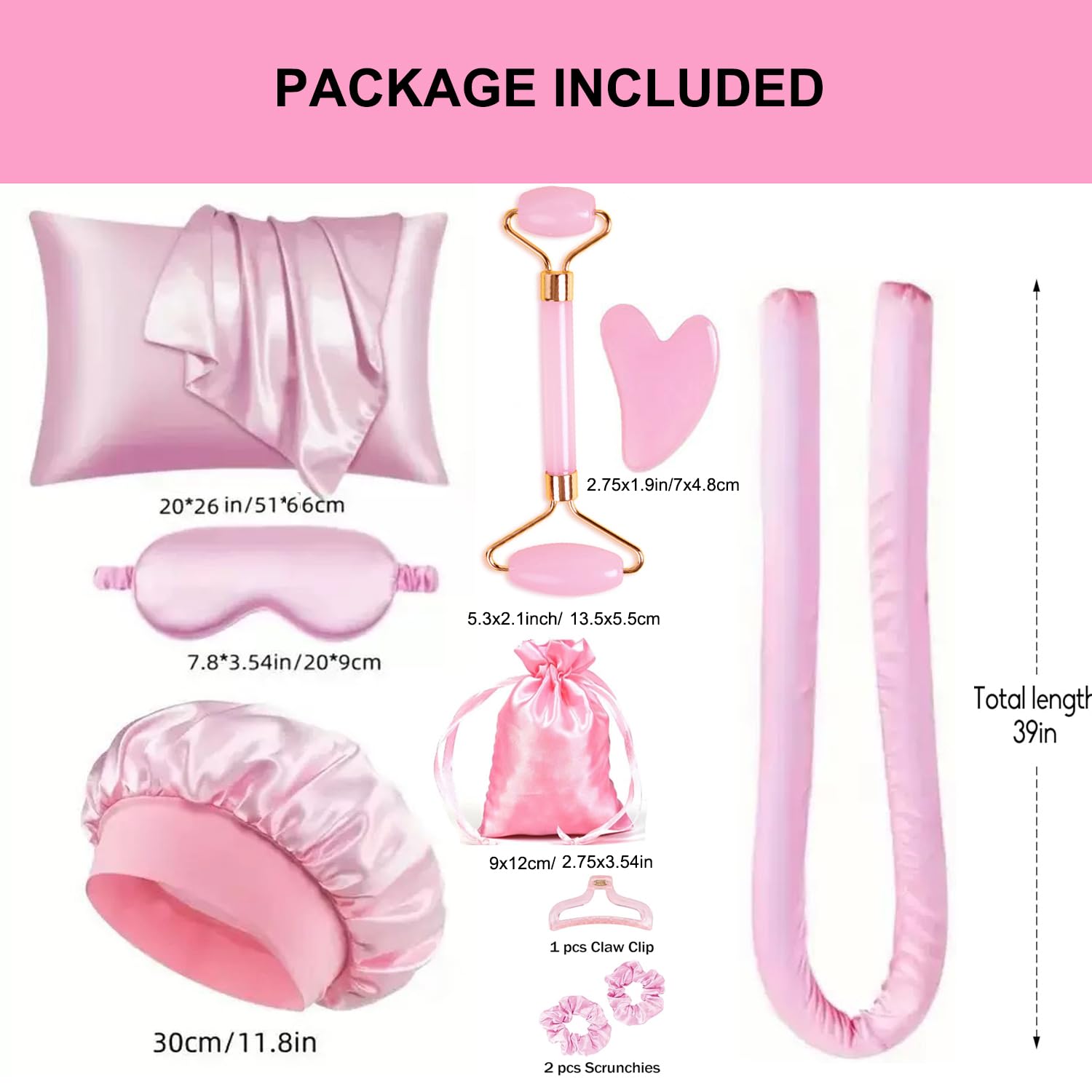 Hair Styling Set Included: A soft satin sleeping pillow case 20x26inch, a sleeping mask,a heatless hair curler overnight set, a Satin Bonnet Silk Hair Bonnet for Sleeping, a face Roller Massage Stick & Gua Sha Set, a pair of scrunchie, a satin jewellery bag