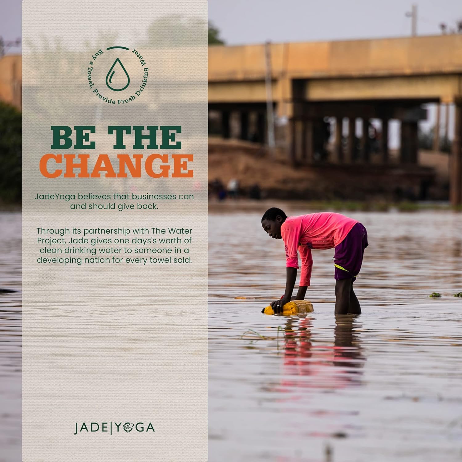 BE THE CHANGE: Here at JadeYoga, we believe that the future needs more than a vision, it also needs action. Thus, through our continued partnership with The Water Project, Jade gives a day’s worth of clean drinking water to someone in a developing country for every towel purchased.