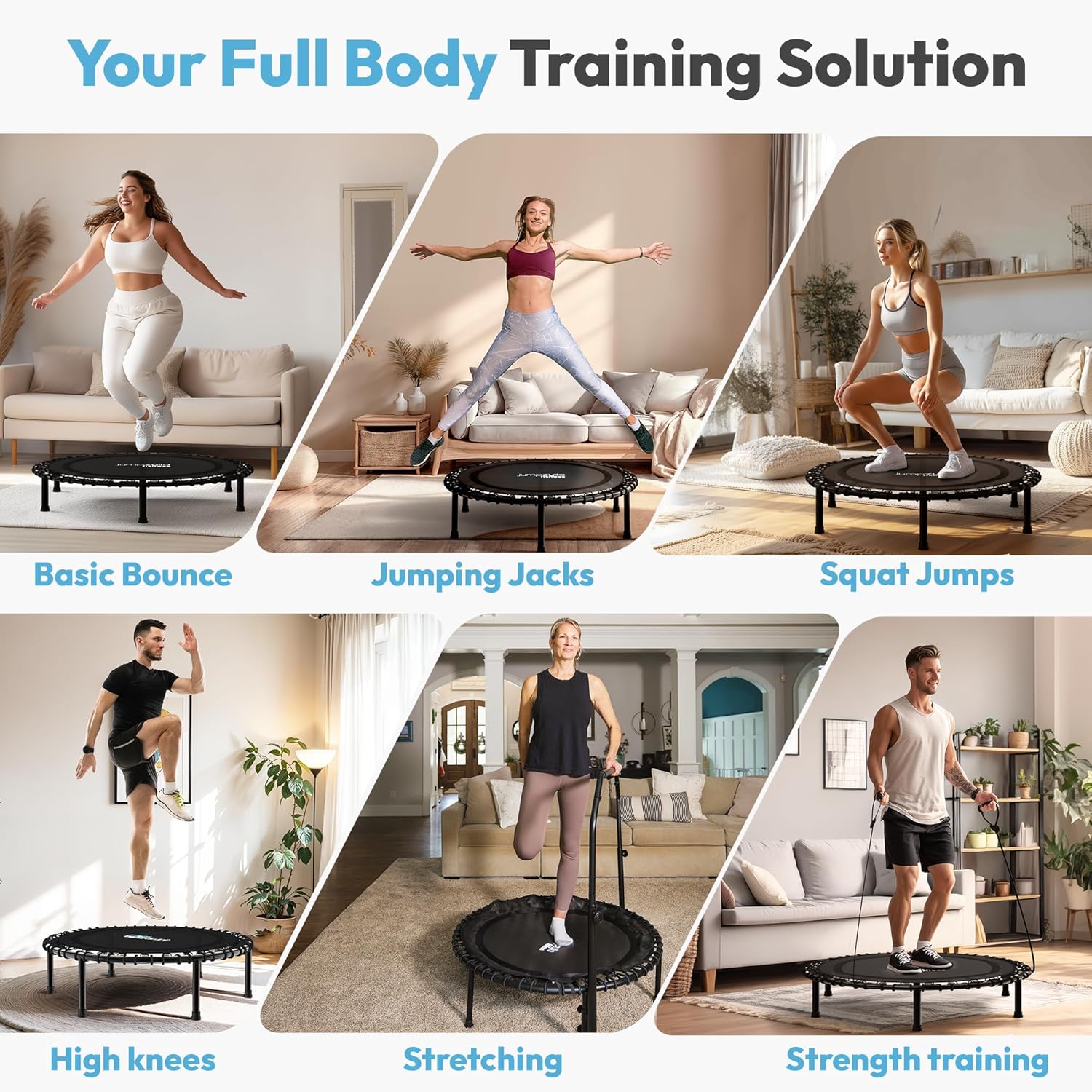 We didn’t just want to create a typical rebounder; we set out to design the best fitness trampoline for adults—a versatile workout tool that combines durability, safety, and, of course, fun! Starting with this goal, the Jumpzylla team analyzed hundreds of fitness trampolines, identifying the key areas for innovation. Our commitment? To make this rebounder not only effective and convenient but also incredibly safe and reliable. Every detail of the Jumpzylla Fitness Trampoline has been thoughtfully crafted. From the quiet bungee bands that reduce joint impact to the stable, 4-level adjustable handle that adds confidence to every jump, we focused on enhancing your workout experience. We designed a foldable frame for easy storage in small spaces, making this mini trampoline perfect for apartments, home gyms, or any room where space matters. Our dedication to quality and care is in every component—from the high-resilience PP mat that endures countless jumps to the sturdy frame that provides unmatched stability. Jumpzylla is more than just a trampoline; it’s a fitness solution built for your wellness journey. So, whether you’re just beginning or looking to elevate your fitness, trust Jumpzylla to bring you a product that’s made to last. Take a leap toward a healthier lifestyle, and let Jumpzylla add a little joy to every jump! 🙂