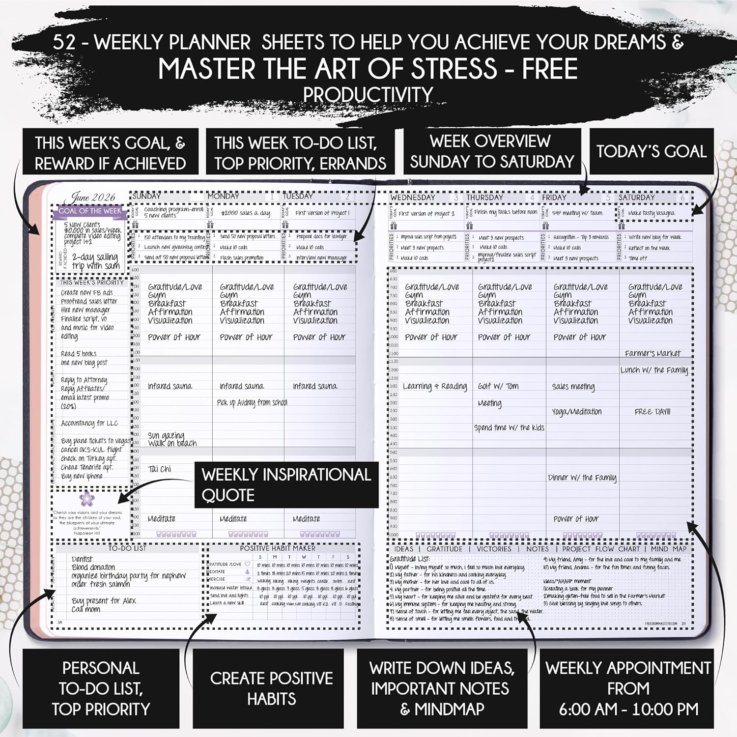2026 LIFE PLANNER – Begin your week with the Sunday Start Planner. A5 size (5.8″x8.3″), 248-page tool for life transformation. It features 52 weekly and 12 monthly planning overviews with reflection sections, 59 dotted journal pages, habit trackers, and mind maps. The planner also includes a fold-out vision board, structured morning and evening routines, and up to 295 affirmation stickers to mark important dates, tasks, or milestones.