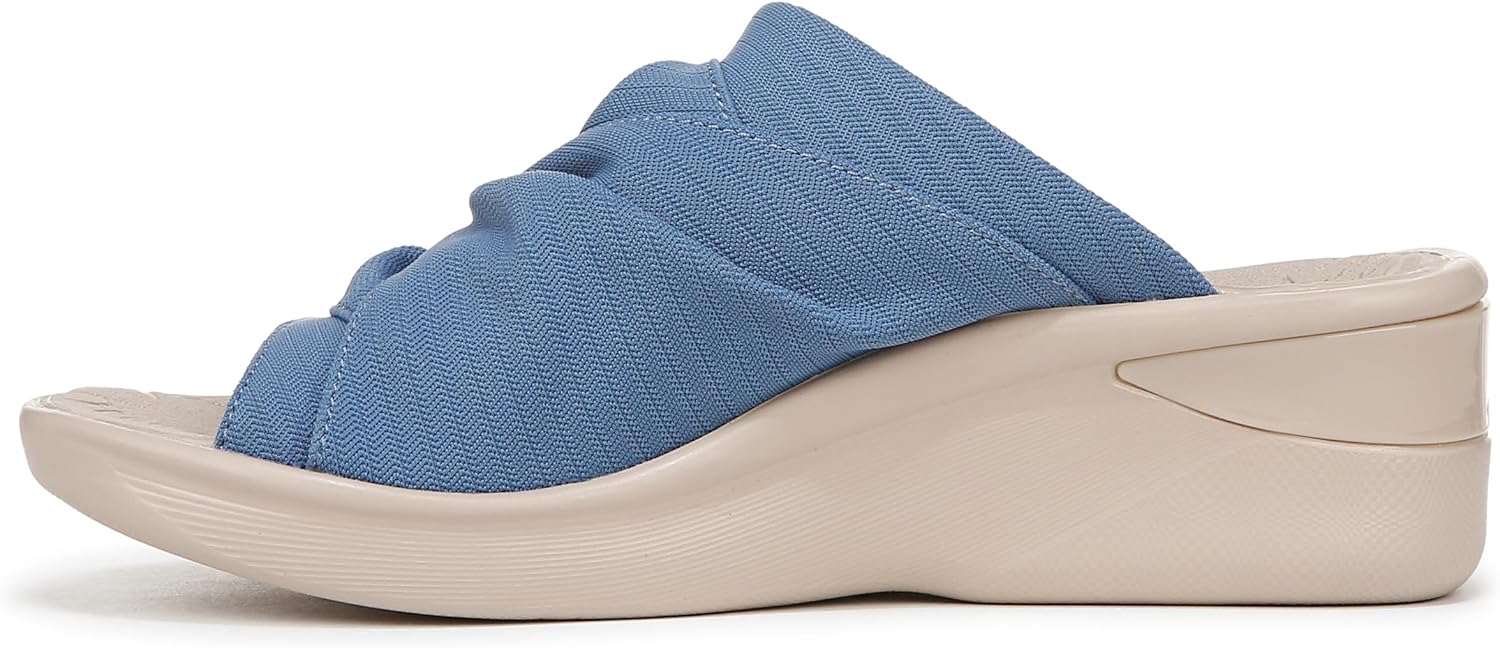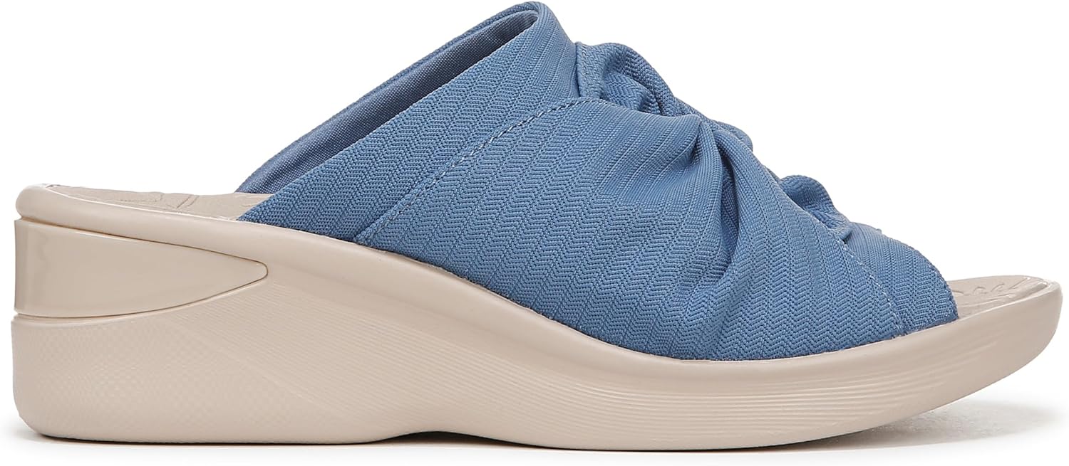 Slip into comfort. The slide sandals you know and love, refreshed with knotted details. Stretch fabric upper with a round toe. Decorative knotted detail. Slip-ons for easy on/off. BZEES Air Step Technology: Designed so you’ll feel weightless, energized and free. Ultra Lightweight: Step lightly with a nearly weightless feel. Dynamic Stretch Fabrics: Move freely in shoes with built-in stretch. FreeFoam™ Comfort: Low pressure insoles with maximum foot contact and cushy arch support. Anti-Microbial and Odor Control technology. 1 inch platform, 2 inch wedge heel. Get Width It: Countless pairs of Bzees come in wide width shoes for women. Machine Washable: Wash on cold and air dry.