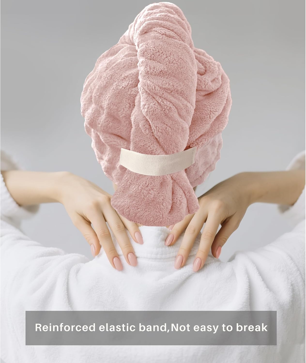 I ordered some towels like this from a different seller on Amazon recently, and was looking for something like a turbie twist, because that is what I was using before. Super disappointed in those, basically because I have waist length hair, and those were way short…can’t return them, already washed them/tried them. Came across these, and O.M.G! These towels are exactly what I was looking for!! My hair is waist length, and extremely thick, and those covers my whole head of hair…these are super soft, and plush. I wear it about 15-30 minutes ( I don’t really time it) and my hair can air dry from there. Super absorbent, super soft, and have used them religiously since I bought them, and have been washed countless times with zero issues. Band on back to secure towel and thick, and well made. I bought them because of the reviews, but the colors are beautiful. Will use these until they fall apart (that’s gonna be a long time lol.)