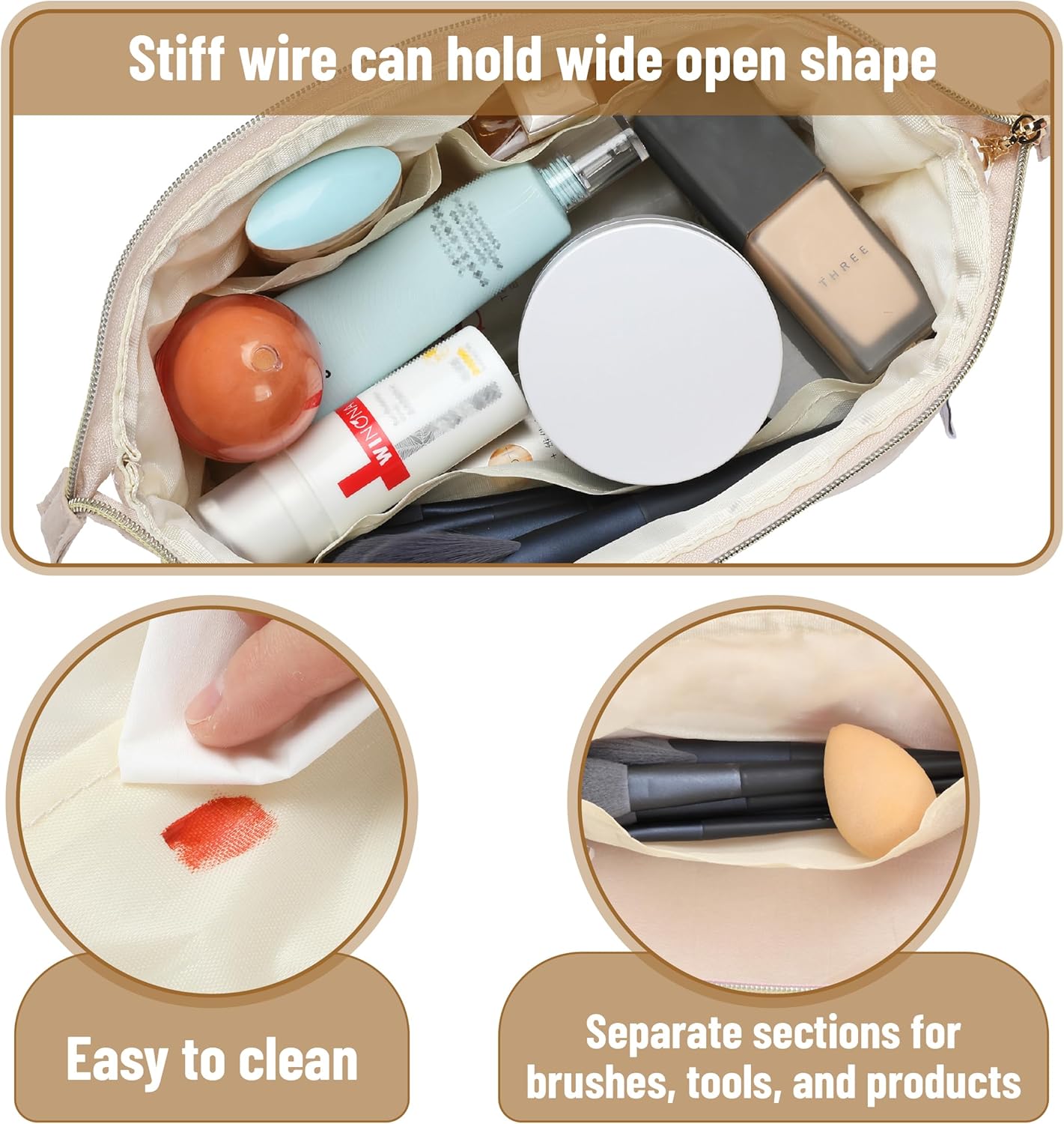 This is a great beige, puffy, quilted makeup bag for the price! The beige color is very light…almost a cream color. The gold zipper is good quality. The bag has a wire sown inside that is located up near the top of the bag that allows for a wider opening. I like that it has a wider opening and I can easily find items in the bag. There is one large inside pocket on one size and two smaller pockets on the other side. The bag size is as described and is lightweight and easy to fit in luggage, backpacks, etc. I highly recommend this affordable quilted makeup bag to hold makeup, skincare products and brushes!