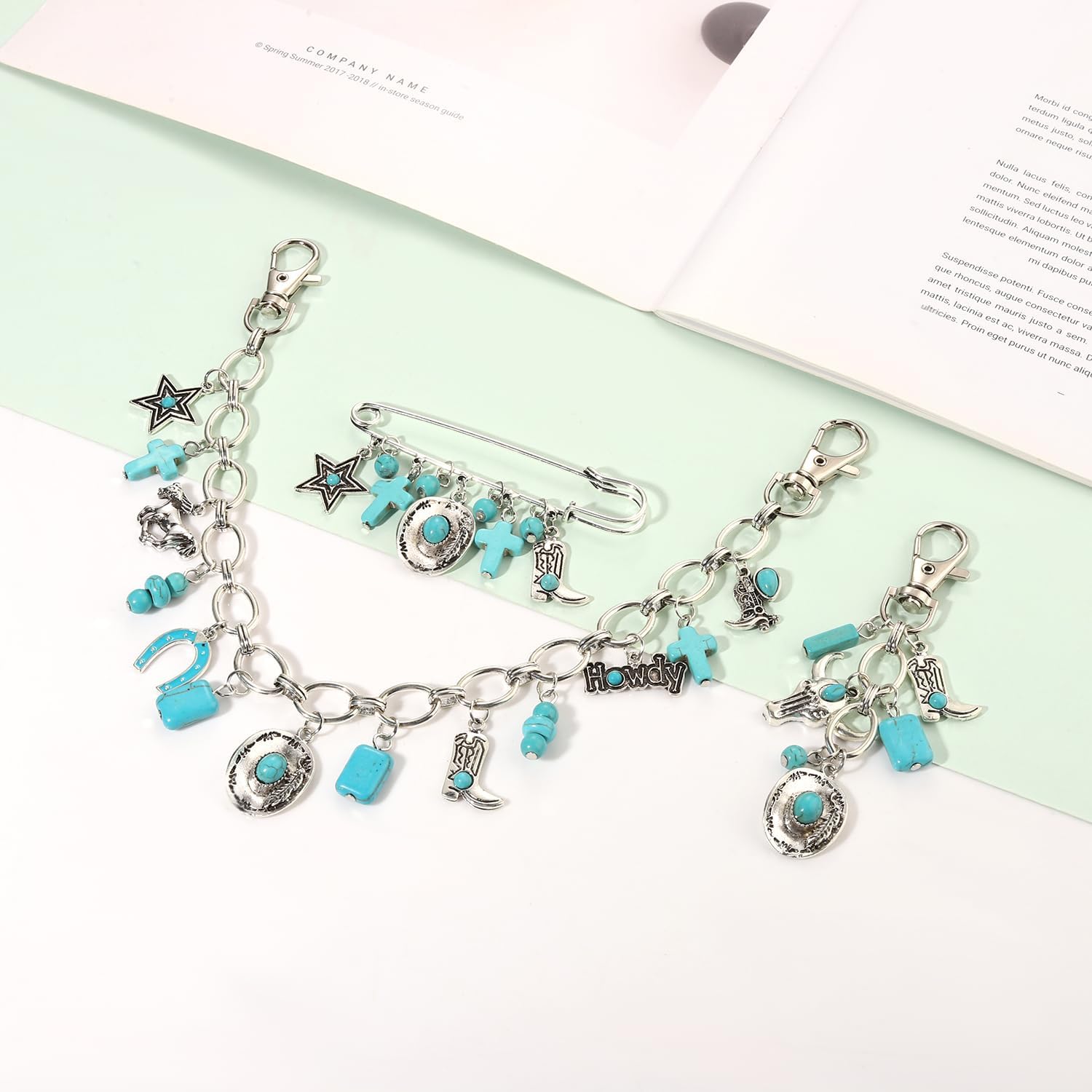 ღ Turquoise Bag Charms: Add a splash of personality to your favorite tote, purse, or travel bag with our 3-in-1 bag charms! Including a purse chain, a keychain and a brooch, decorated with Western charms. Clip the turquoise purse charms keychains to your favorite bag, backpack, tote or set of keys for a classic Western outfits