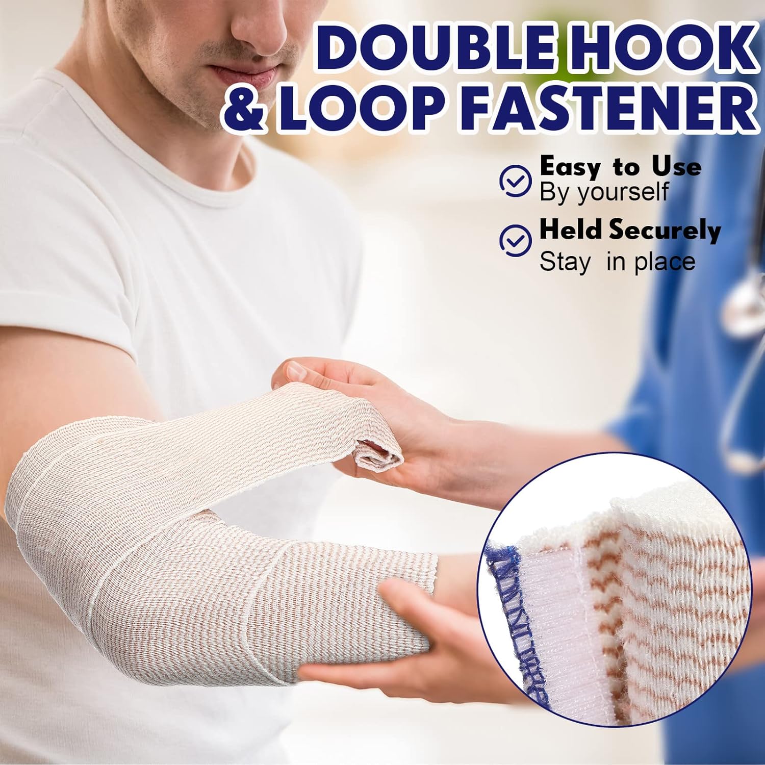Self Closure Design: this elastic compression bandage has reliable hook and loop closure at both ends to allow quick wrapping, and can keep a tight fit for hours, which is necessary and useful in an emergency, it provides constant pressure with strong adhesion to fix itself in place, without the use of clips or tape, easy and convenient