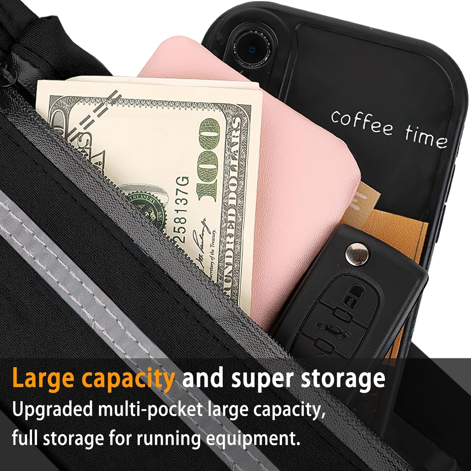 Absolutely love this running belt, hold my keys and phone and the belt doesn’t bounce as I run and is very comfortable while wearing.
