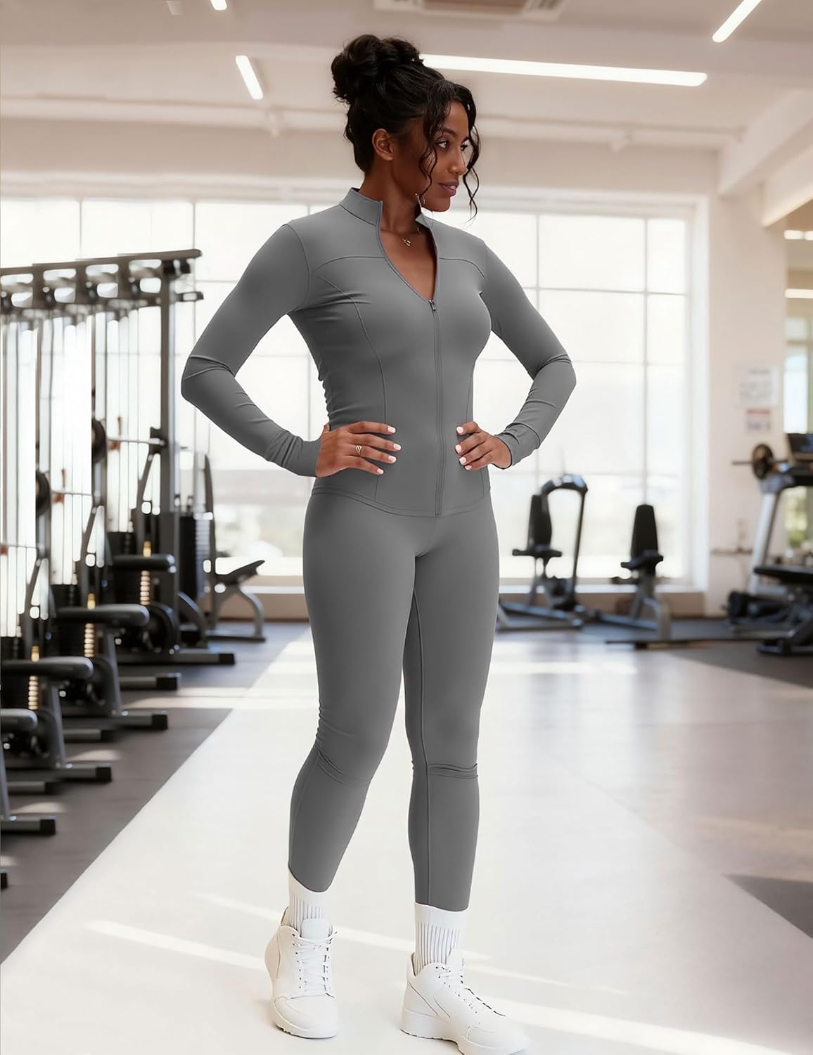 Such an adorable, sexy outfit! No matter what your body type is, if you get the right size, you’ll love how this fits and looks. The material is thin, but not in a cheap way. It fits close to the body, but the top is forgiving enough to conceal any areas of the midsection that you’re not comfortable with. Personally, I love these matching workout sets. They are perfect for everyday errands.***In the first photo, I tied the back of the top to make it more cropped. The second picture, taken from behind, shows that the top has a regular/long-length zip-up design. I wanted to include the first picture to show how easily this material can be customized. I highly recommend this set. Love it!!!