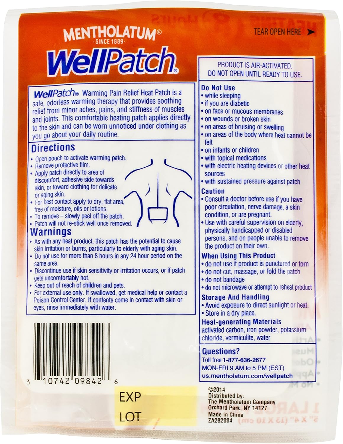 WellPatch Warming Pain Relief Heat Patch provides long-lasting soothing relief from minor aches, pains and stiffness of muscles and joints. This comfortable, drug-free and odor-free heating patch applies directly to the skin and can be worn unnoticed under clothing as you go about your daily routine