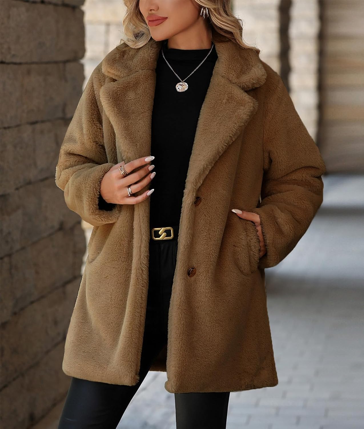 Women’s Faux Fur Long Coat Button Down Lapel Fleece Sherpa Jacket
